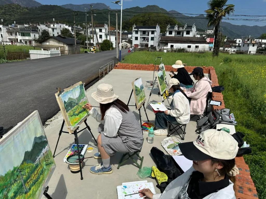 写生期间,学生们听从指导老师的安排认真完成写生作业,利用此次难得的机会观摩老师绘画过程,虚心向老师请教。“纸上得来终觉浅,绝知此事要躬行”。同学们都深深感受到了自己所学风景画的写生和创作知识的匮乏,通过此次写生课程丰富了绘画理论知识和风景绘画实践技巧。在婺源沱川乡,同学们欣赏着一排排粉墙黛瓦、马头墙式的徽派建筑,陶醉于一片片油菜花海梯田,感受小桥流水人家古村落原始自然生态风光,在自然世界的怀抱里,老师们和学生们兴高采烈地绘画着,他们用眼、用心捕捉着美丽的风景,就算是下雨天依然阻挡不了同学们的绘画热情,他们有的搬起马扎,来到小亭子里,有的来到走廊边、小河边一坐很快就投入绘画中。