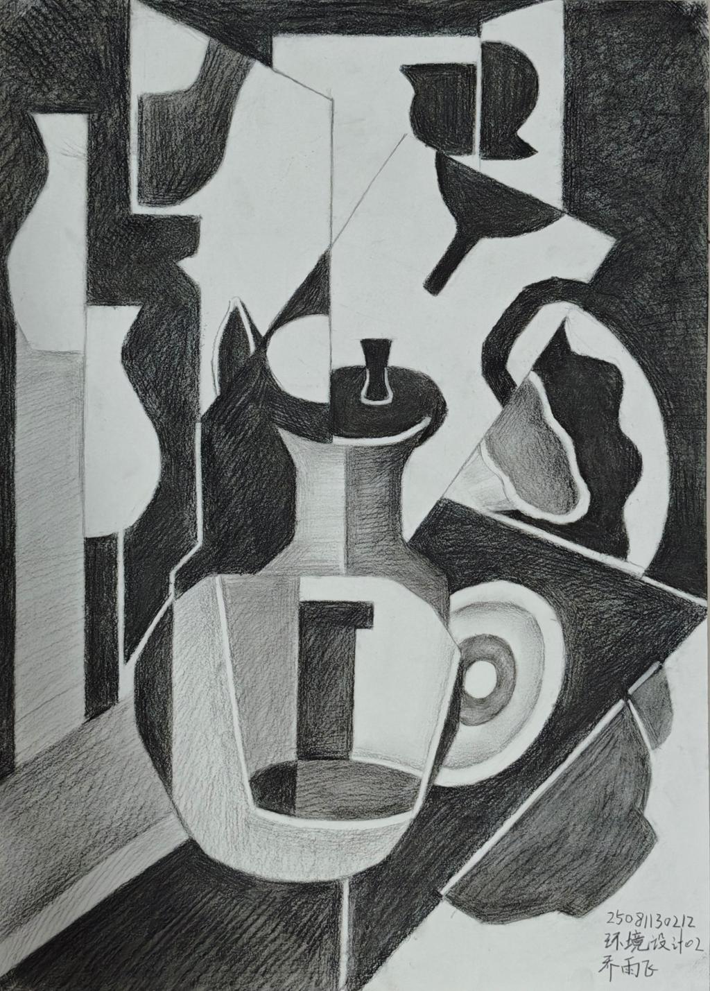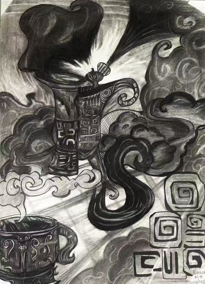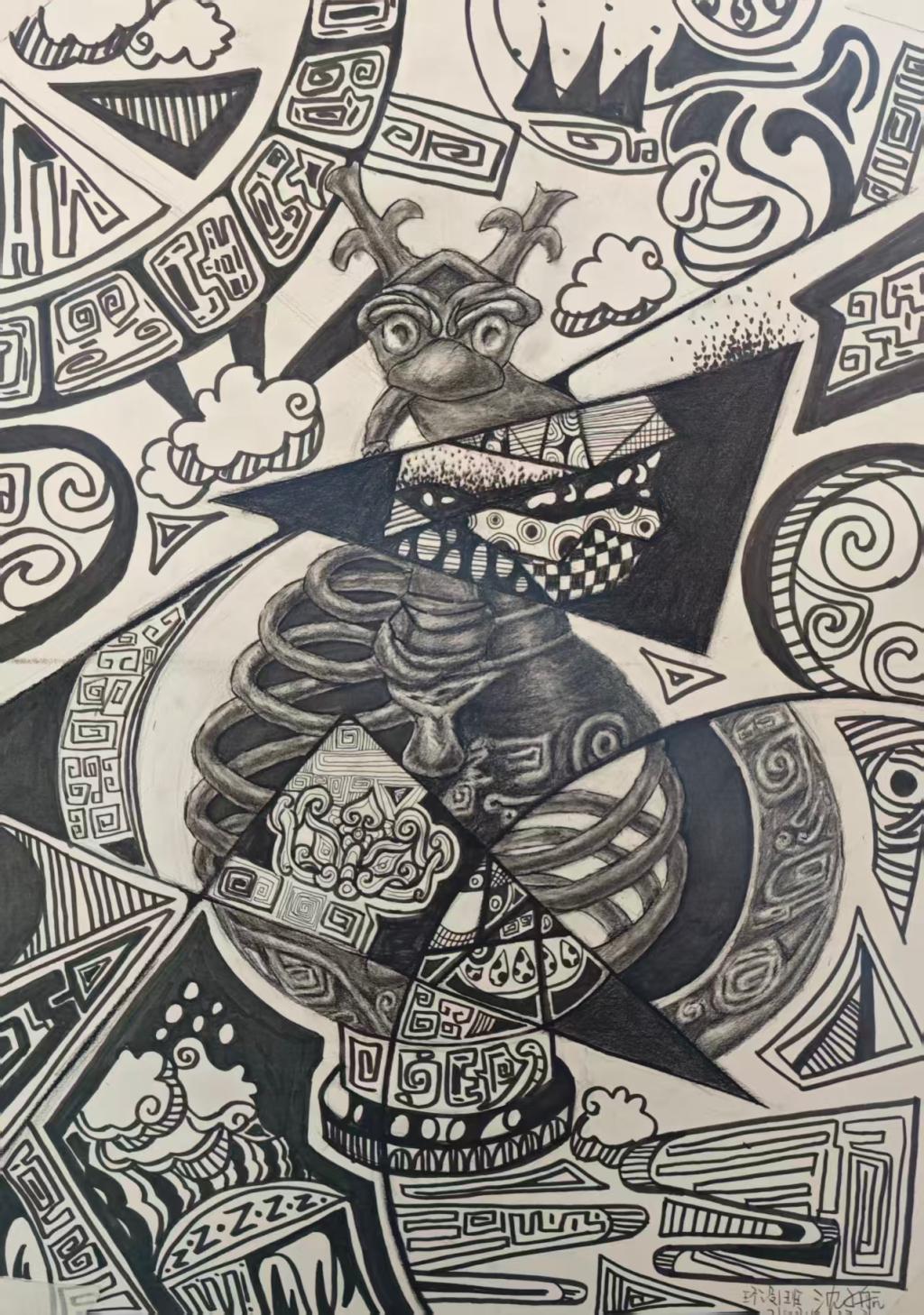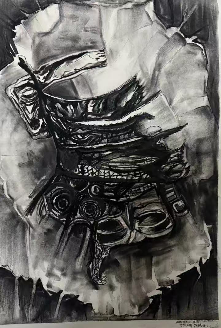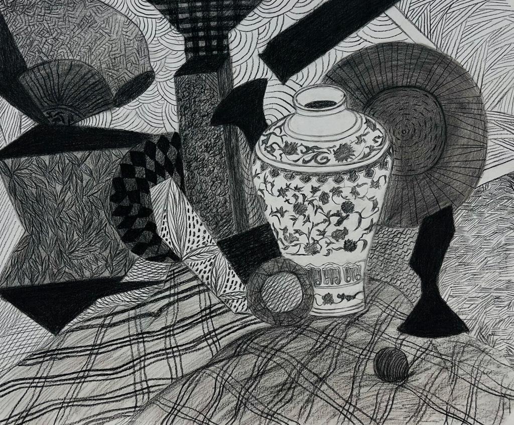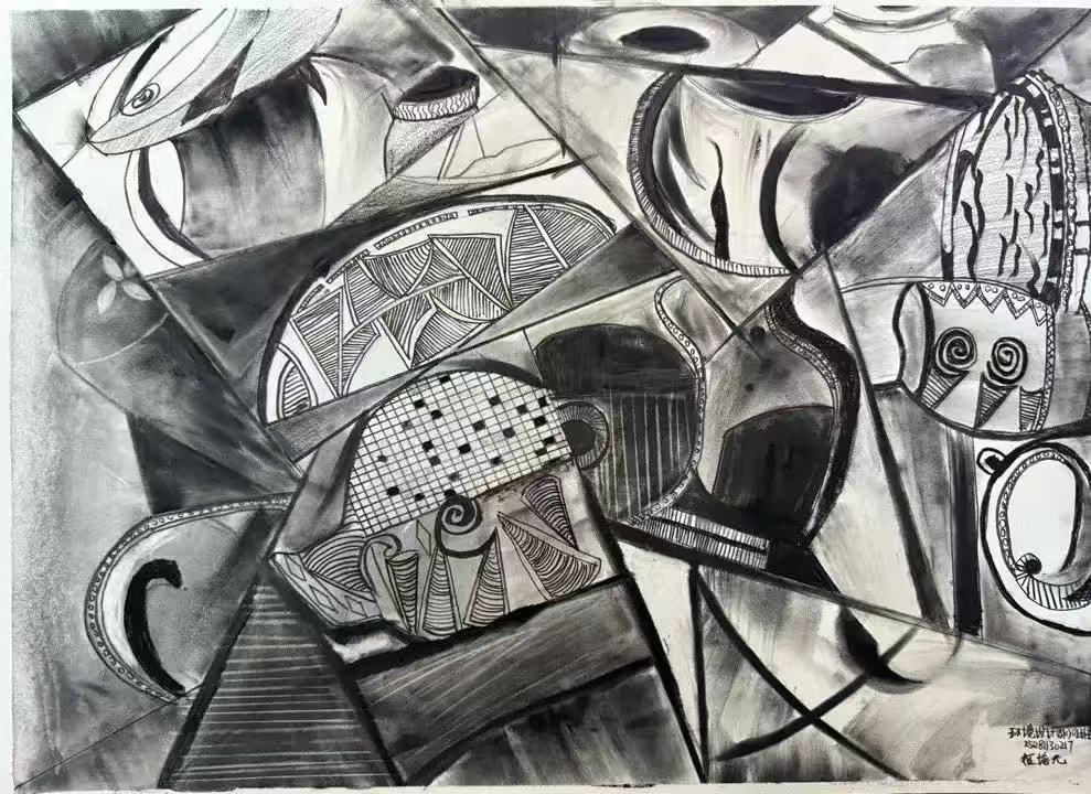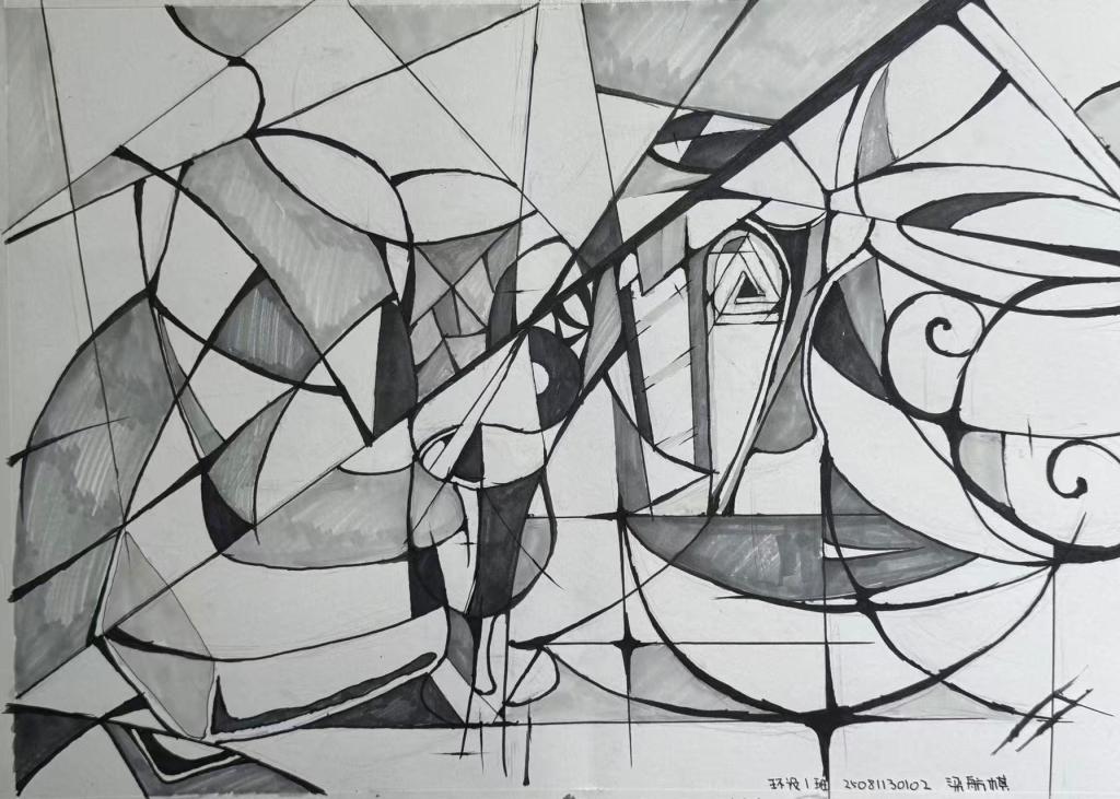 本次展出的作品,有的聚焦传统审美纹样,从传统绘画中提取设计元素,赋予素描作品别样的装饰美感;有的大胆突破写实边界,通过夸张、变形与重组的手法,将日常物件转化为充满想象力的设计雏形;还有的大胆尝试抽象表达,用极简的笔触勾勒出充满韵律感的画面。一笔一画皆是思考,一纸一墨尽是创意,每一幅作品都是同学们观察能力、思考能力与动手能力的结晶,这些作品不仅是技法的凝练,更是同学们设计思维的萌芽。