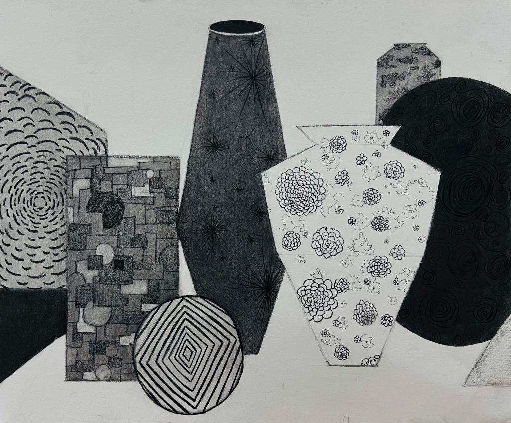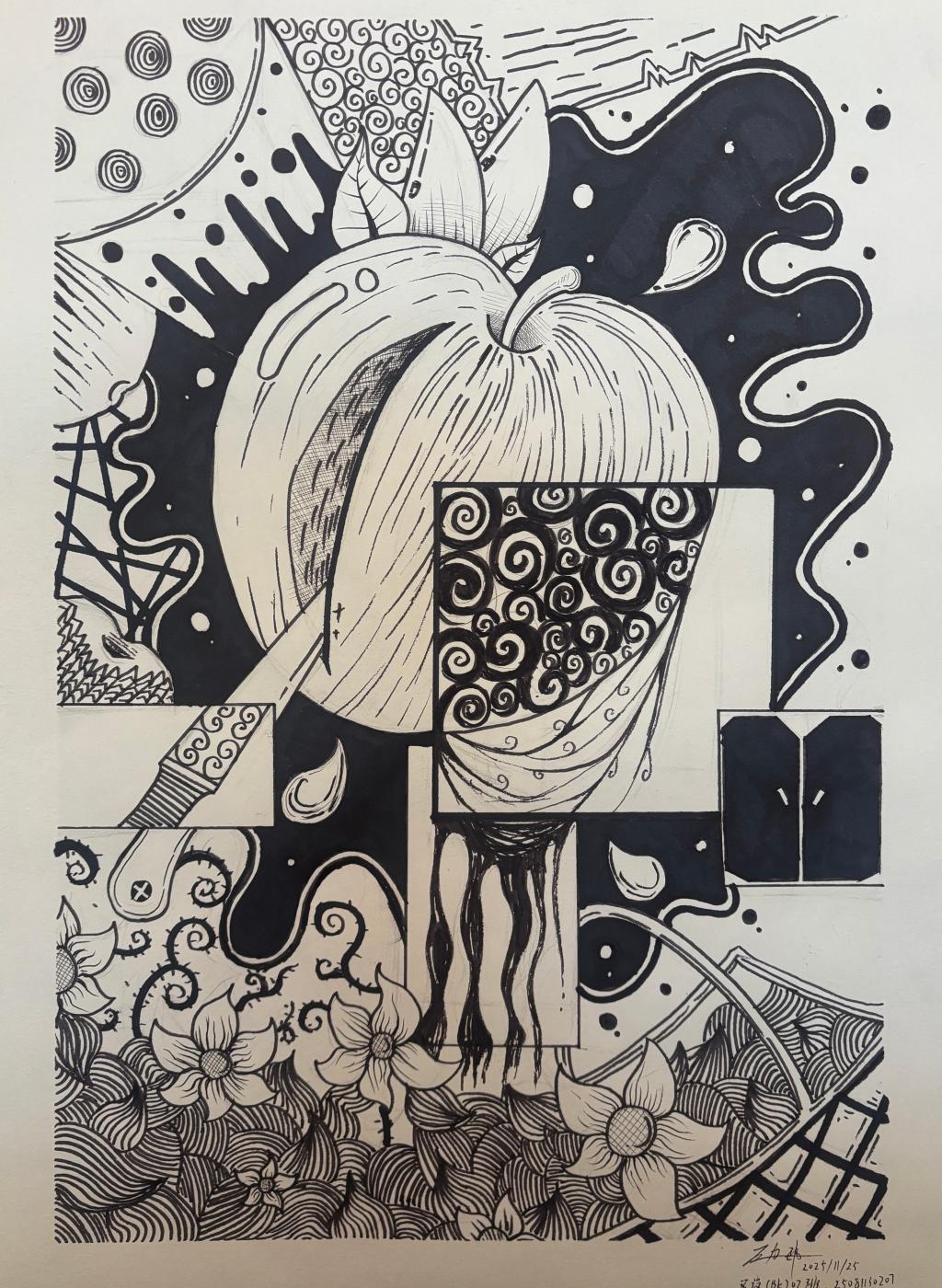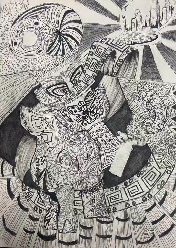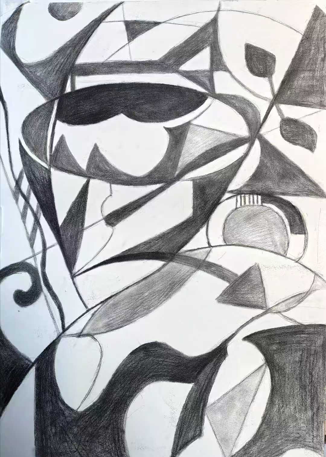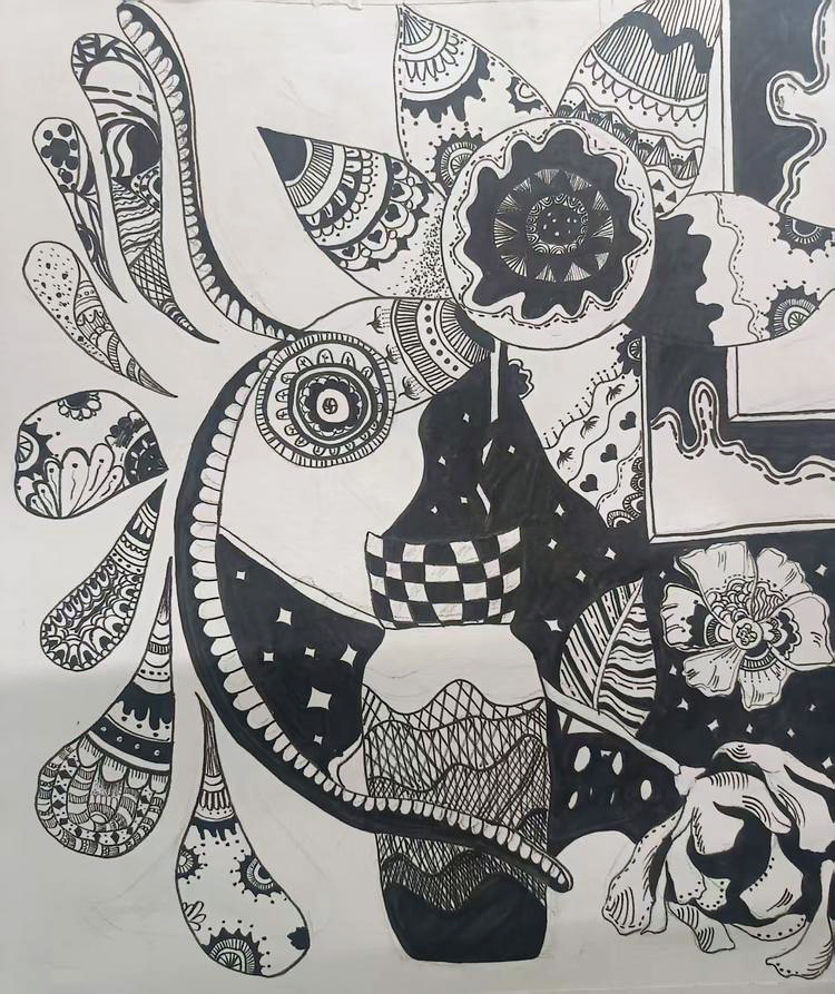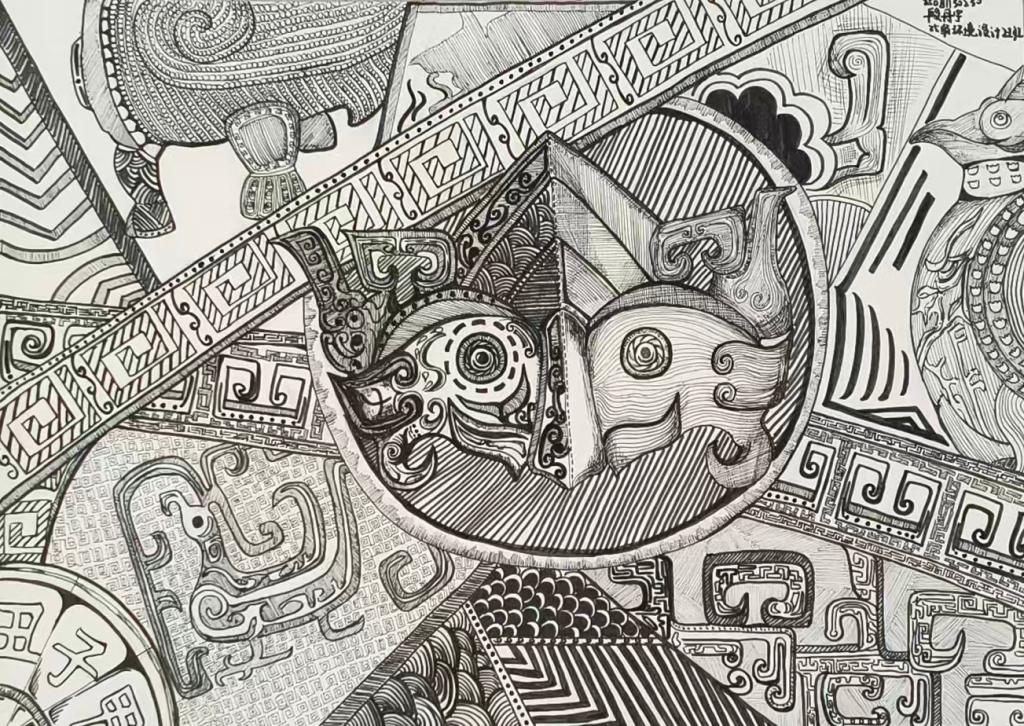 本次展出的作品,有的聚焦传统审美纹样,从传统绘画中提取设计元素,赋予素描作品别样的装饰美感;有的大胆突破写实边界,通过夸张、变形与重组的手法,将日常物件转化为充满想象力的设计雏形;还有的大胆尝试抽象表达,用极简的笔触勾勒出充满韵律感的画面。一笔一画皆是思考,一纸一墨尽是创意,每一幅作品都是同学们观察能力、思考能力与动手能力的结晶,这些作品不仅是技法的凝练,更是同学们设计思维的萌芽。