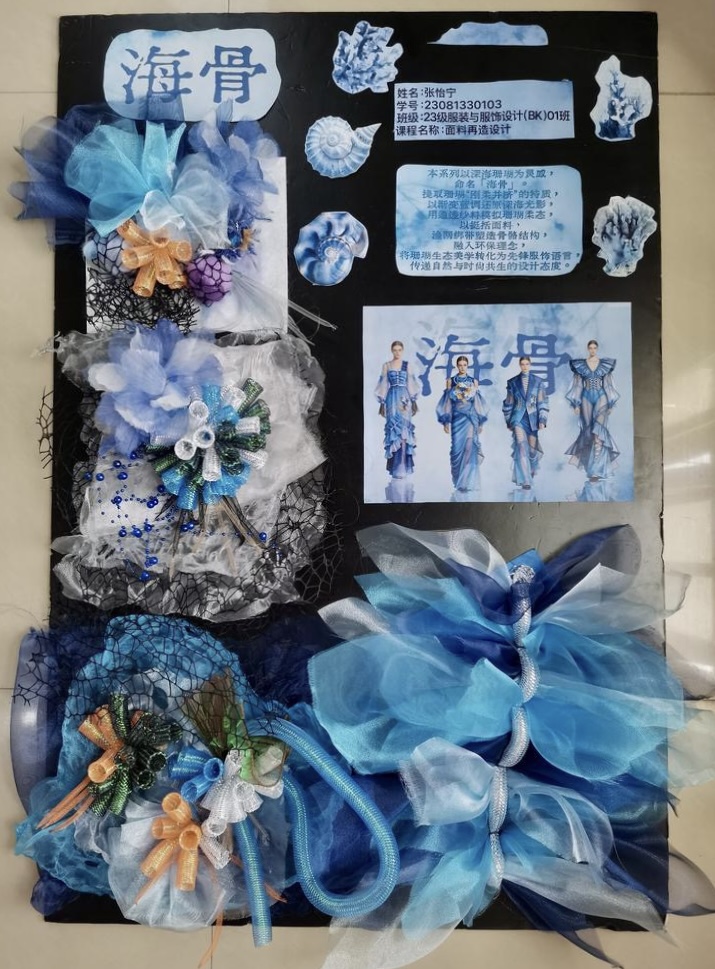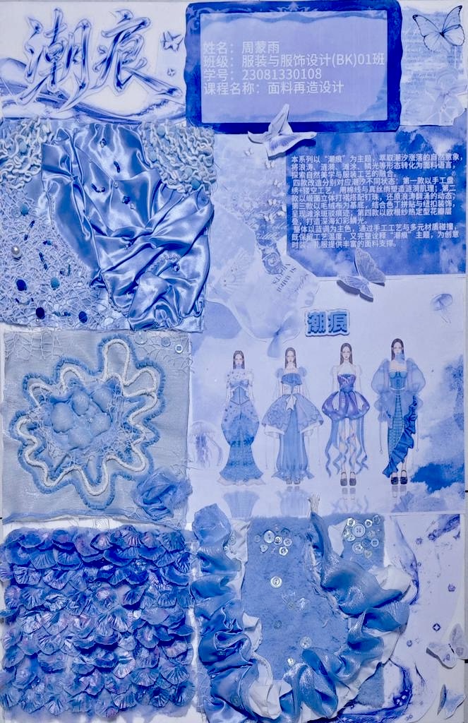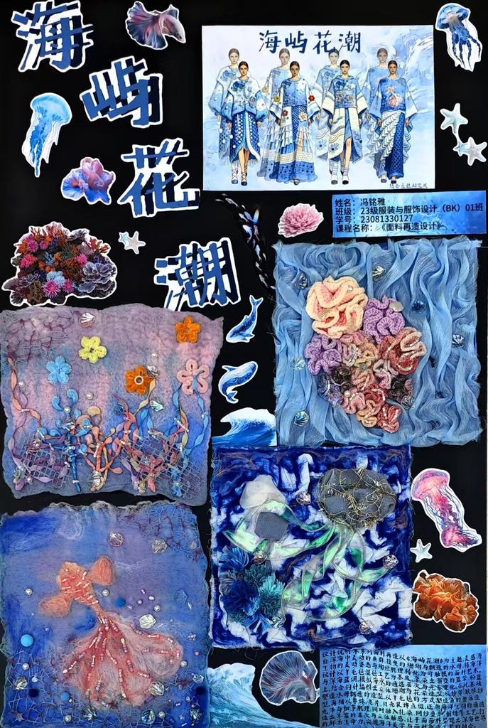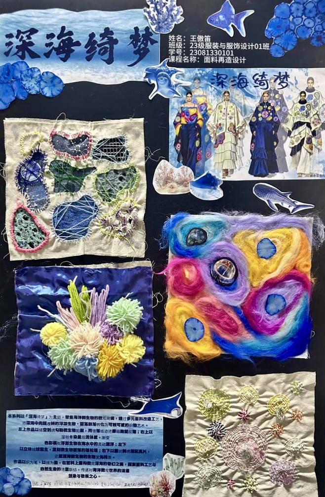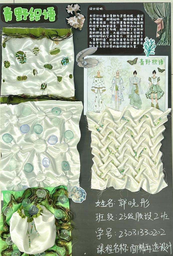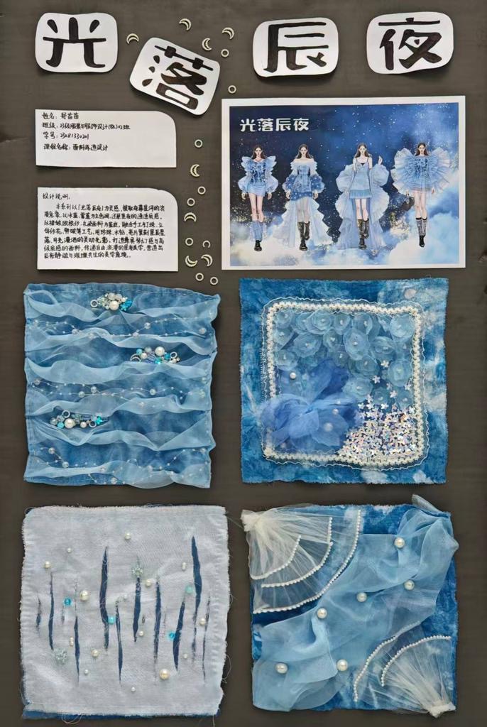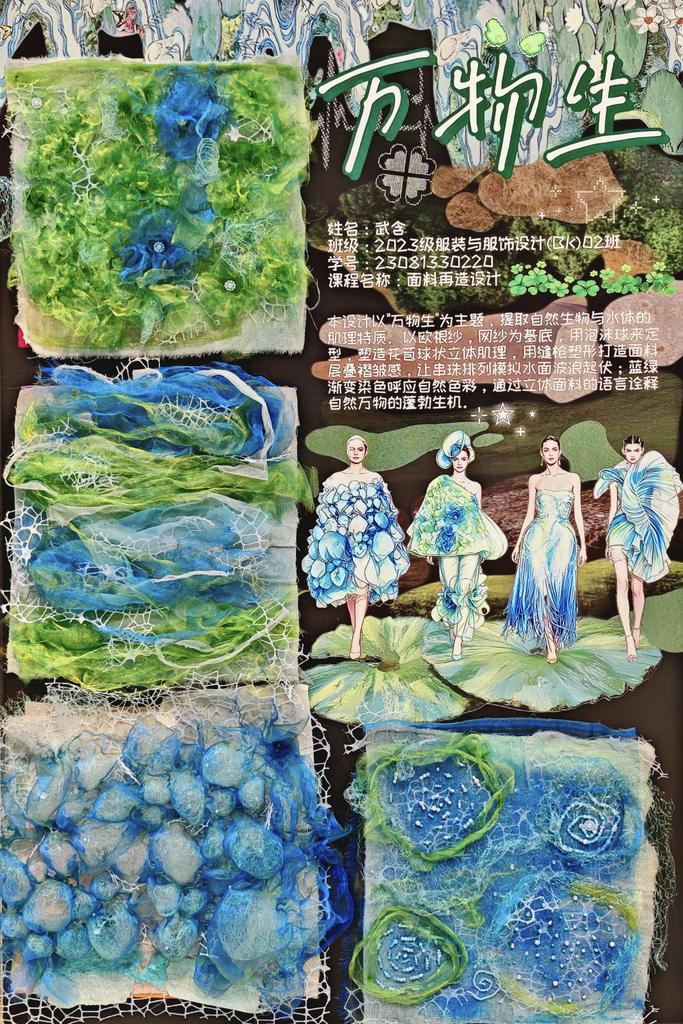 本次教学成果展出内容较为完整地呈现了从前期灵感收集、创意面料制作到结合AI辅助开展创意服装设计的学习过程,反映出学生在材料探索、工艺实践和设计表达方面的积极尝试。从所有作品的最终效果来看,学生在课程训练中逐步形成了对面料再造设计的基本认识,并在实践中不断增强动手能力和创新意识。部分作品在材料组合、肌理处理和形式转化方面具有较强的探索性,体现了课程在培养学生设计思维、实践能力和综合表达能力方面取得的较好成效,也为学生后续专业课程学习、毕业设计开展和未来职业发展积累了实践经验。