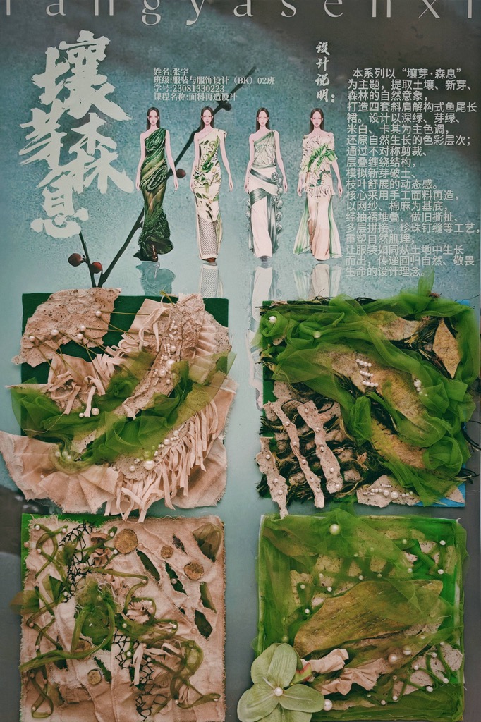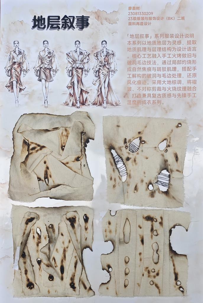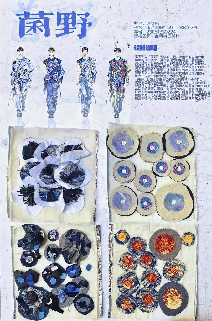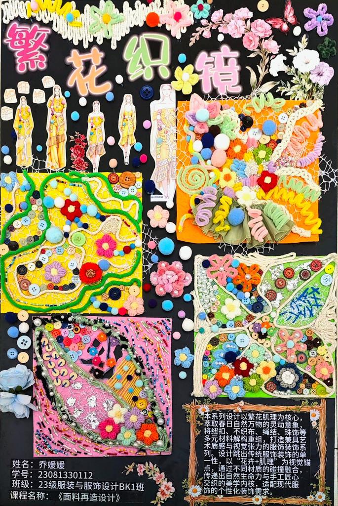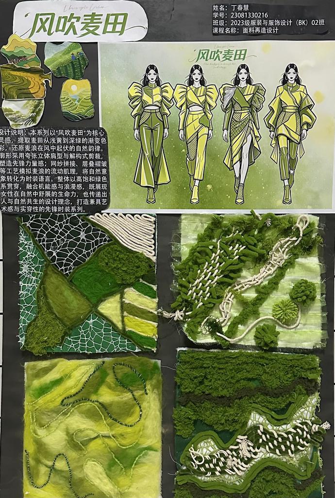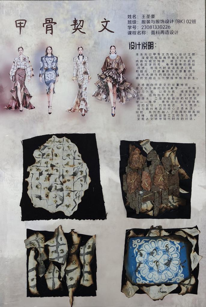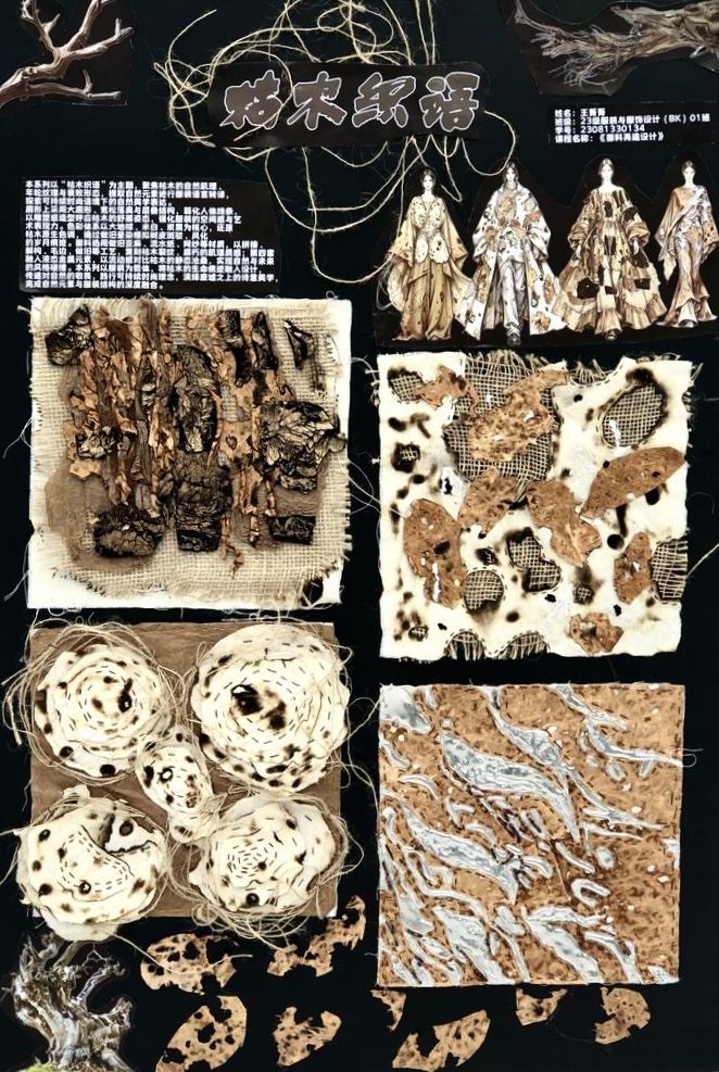 本次教学成果展出内容较为完整地呈现了从前期灵感收集、创意面料制作到结合AI辅助开展创意服装设计的学习过程,反映出学生在材料探索、工艺实践和设计表达方面的积极尝试。从所有作品的最终效果来看,学生在课程训练中逐步形成了对面料再造设计的基本认识,并在实践中不断增强动手能力和创新意识。部分作品在材料组合、肌理处理和形式转化方面具有较强的探索性,体现了课程在培养学生设计思维、实践能力和综合表达能力方面取得的较好成效,也为学生后续专业课程学习、毕业设计开展和未来职业发展积累了实践经验。