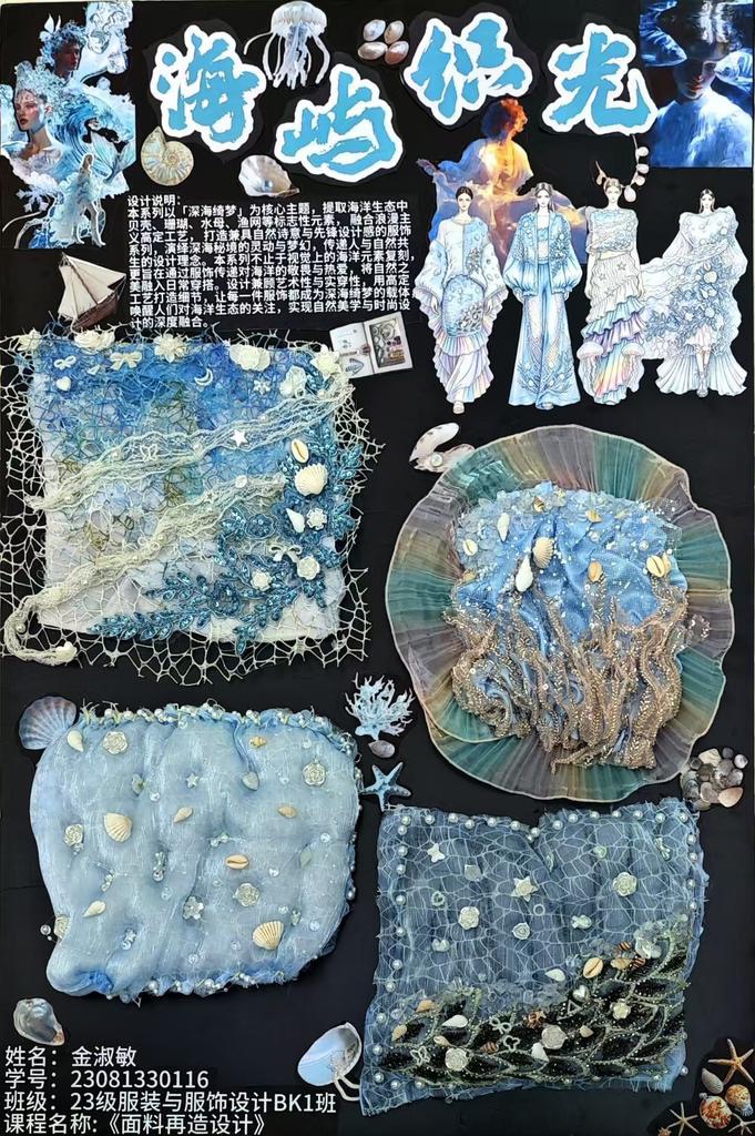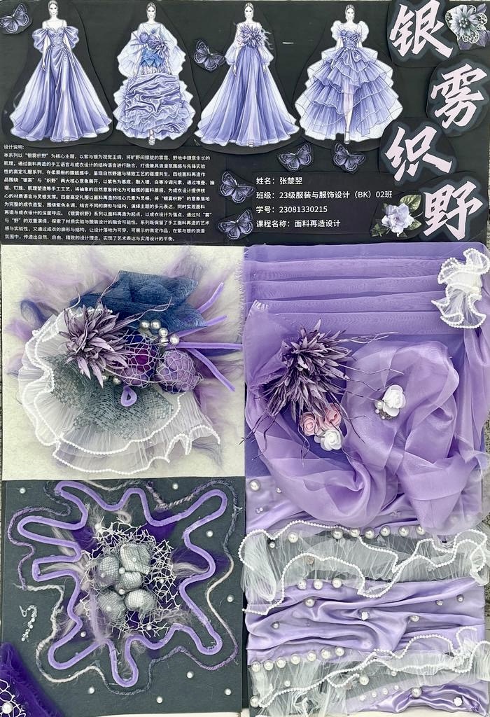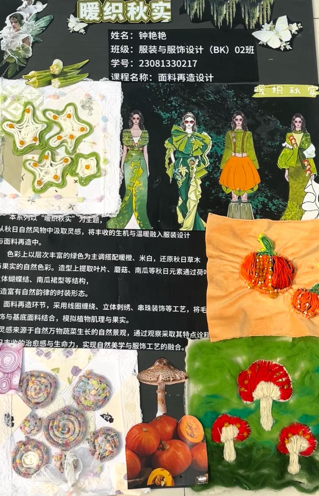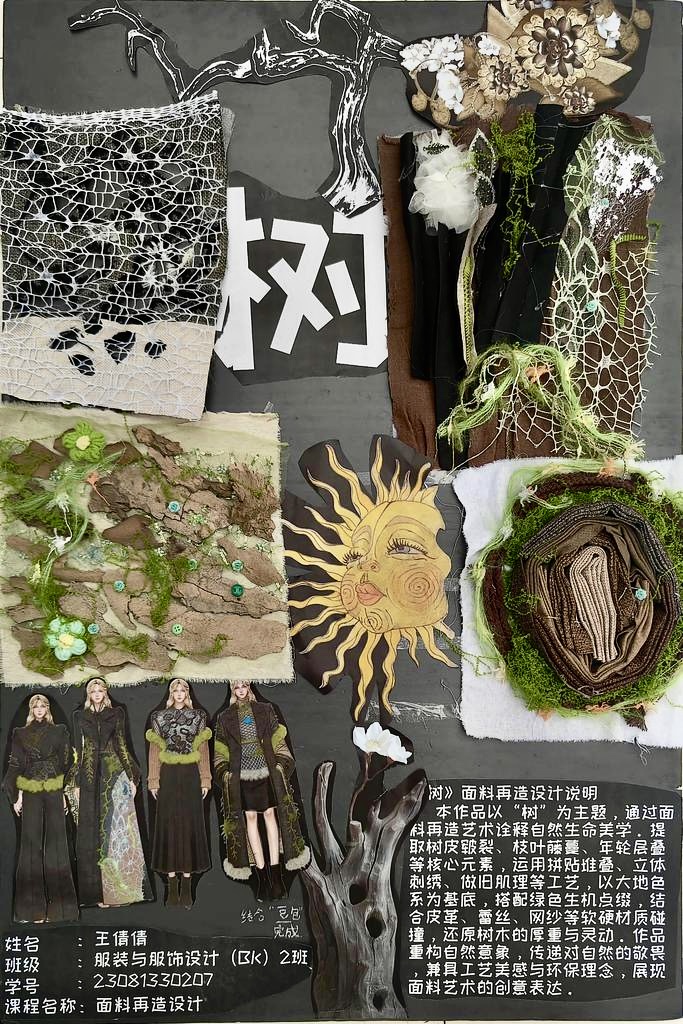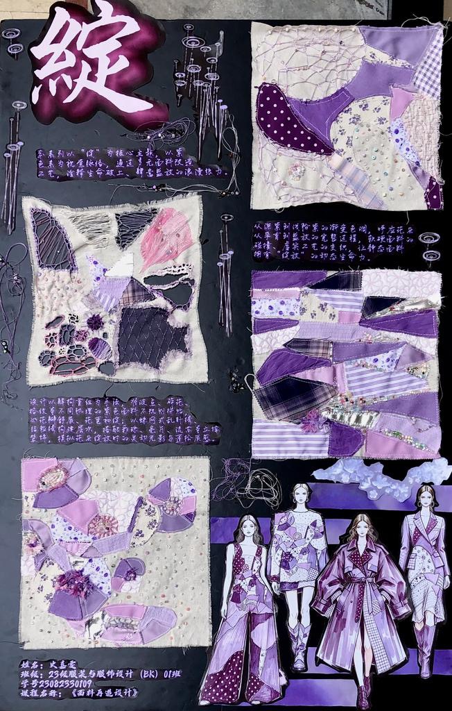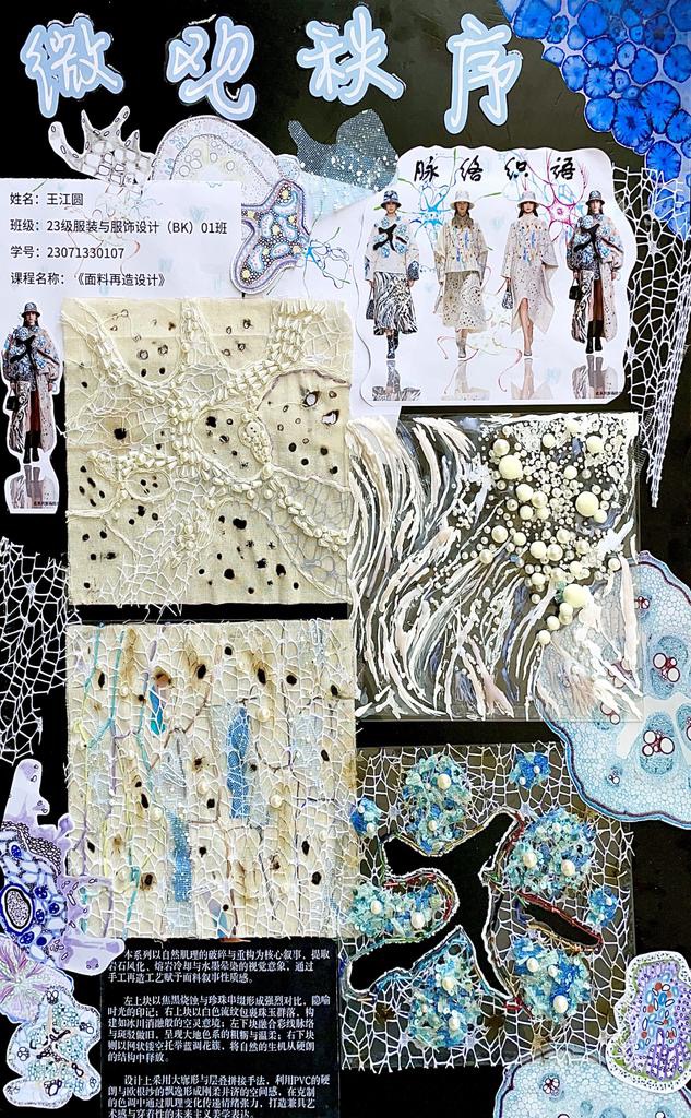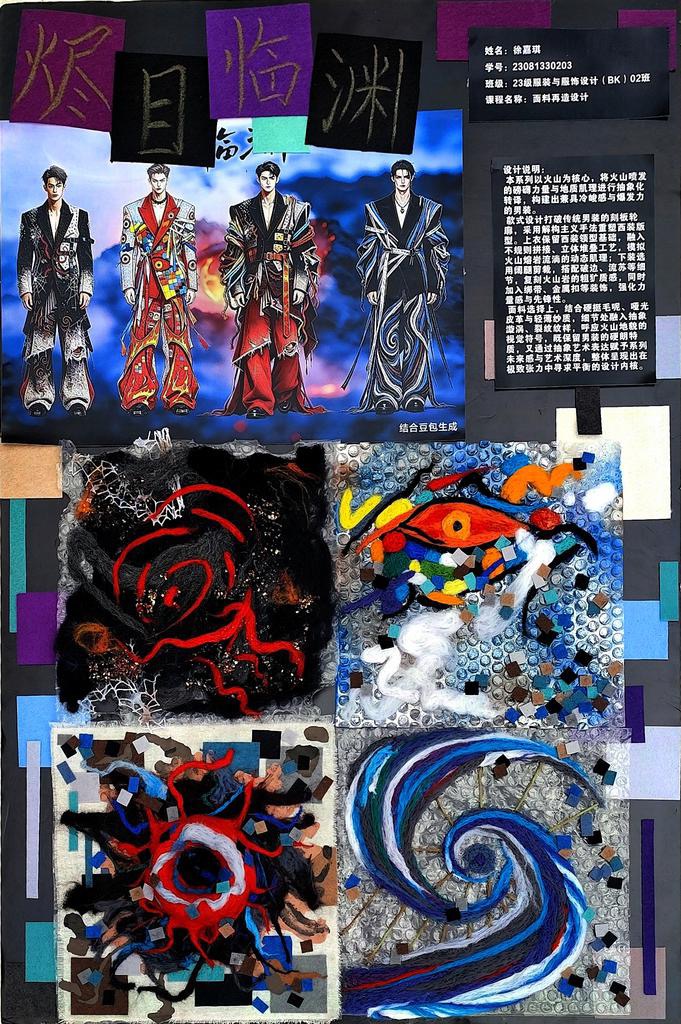 本次教学成果展出内容较为完整地呈现了从前期灵感收集、创意面料制作到结合AI辅助开展创意服装设计的学习过程,反映出学生在材料探索、工艺实践和设计表达方面的积极尝试。从所有作品的最终效果来看,学生在课程训练中逐步形成了对面料再造设计的基本认识,并在实践中不断增强动手能力和创新意识。部分作品在材料组合、肌理处理和形式转化方面具有较强的探索性,体现了课程在培养学生设计思维、实践能力和综合表达能力方面取得的较好成效,也为学生后续专业课程学习、毕业设计开展和未来职业发展积累了实践经验。