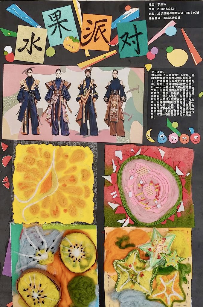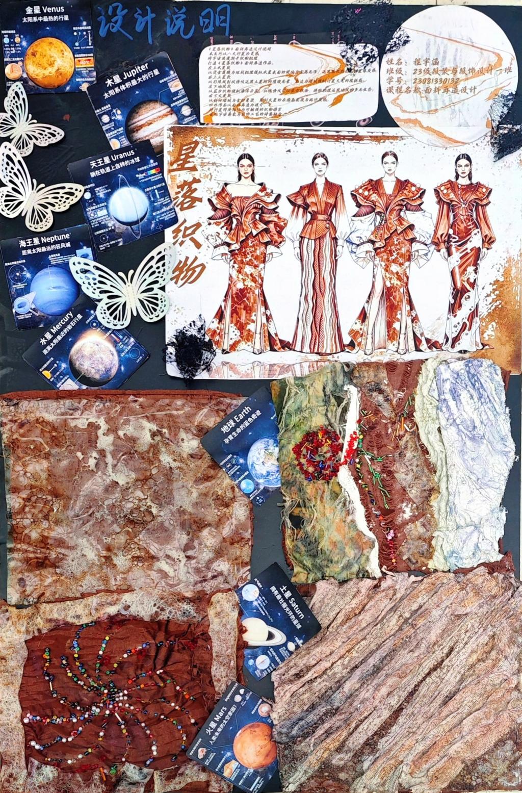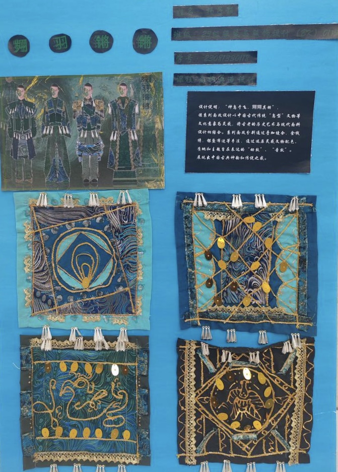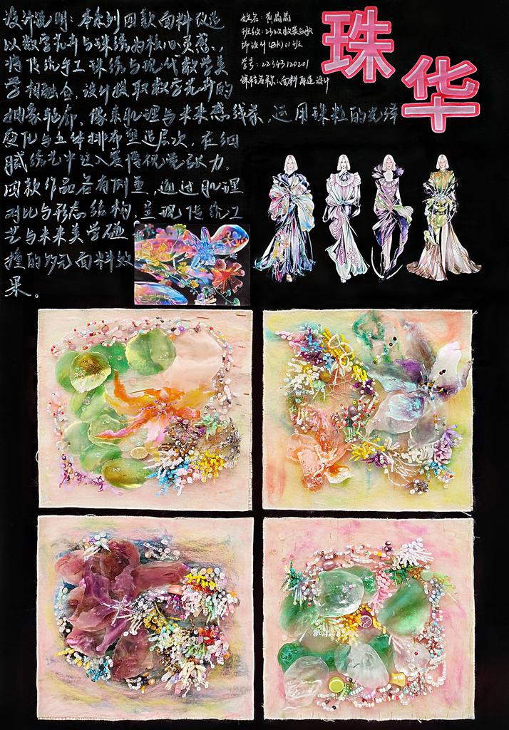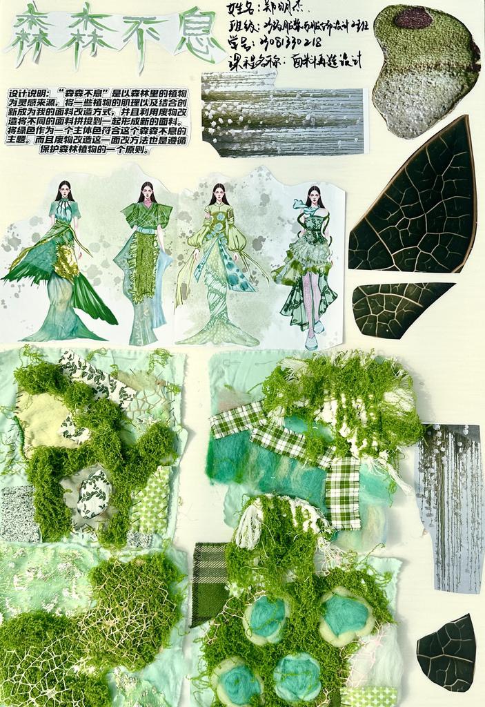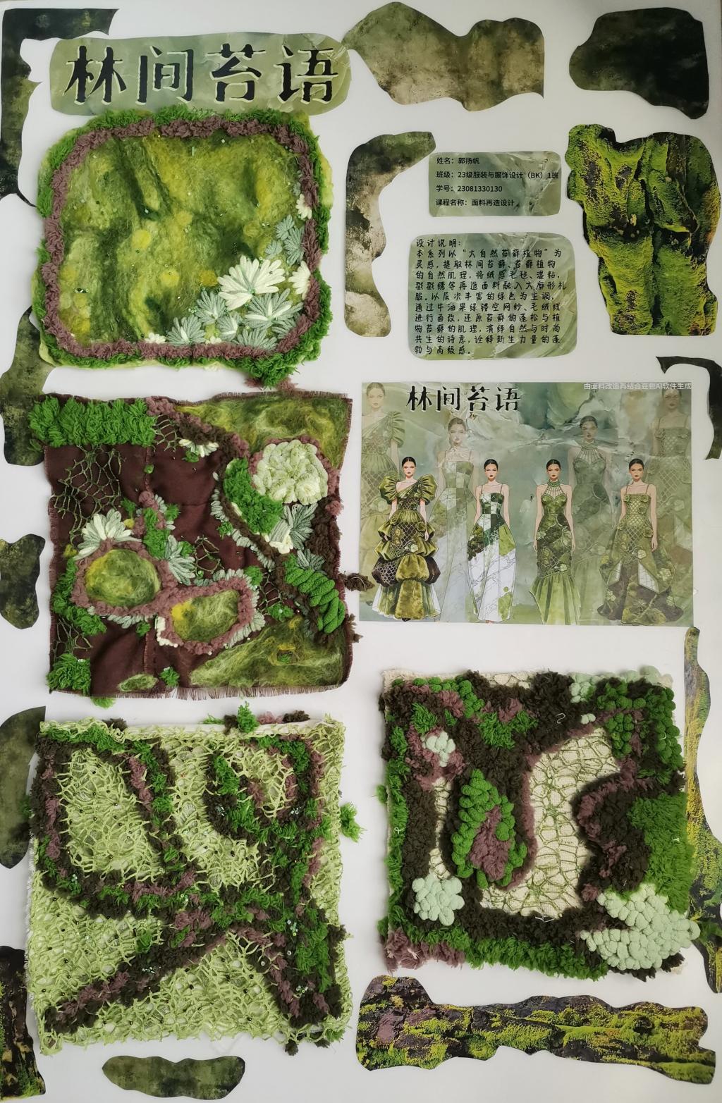 本次教学成果展出内容较为完整地呈现了从前期灵感收集、创意面料制作到结合AI辅助开展创意服装设计的学习过程,反映出学生在材料探索、工艺实践和设计表达方面的积极尝试。从所有作品的最终效果来看,学生在课程训练中逐步形成了对面料再造设计的基本认识,并在实践中不断增强动手能力和创新意识。部分作品在材料组合、肌理处理和形式转化方面具有较强的探索性,体现了课程在培养学生设计思维、实践能力和综合表达能力方面取得的较好成效,也为学生后续专业课程学习、毕业设计开展和未来职业发展积累了实践经验。