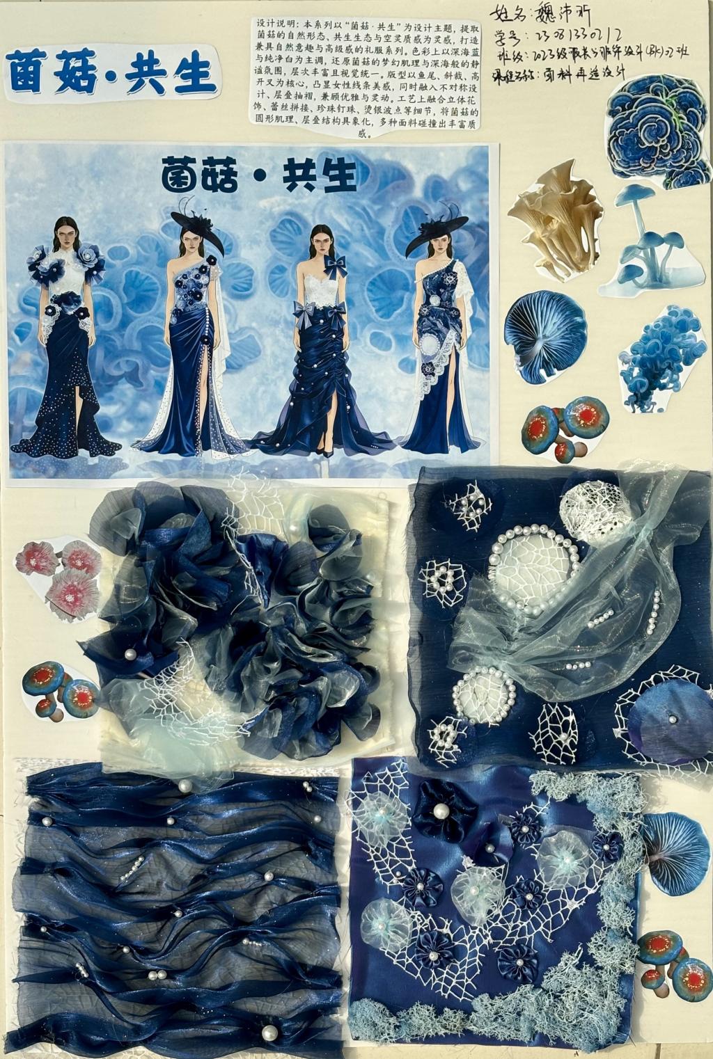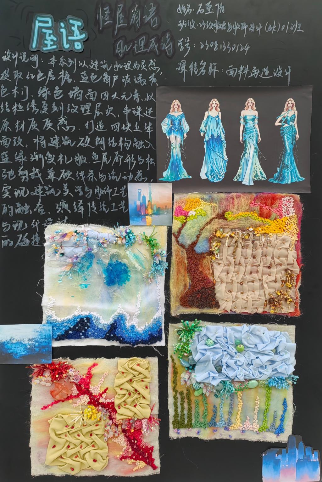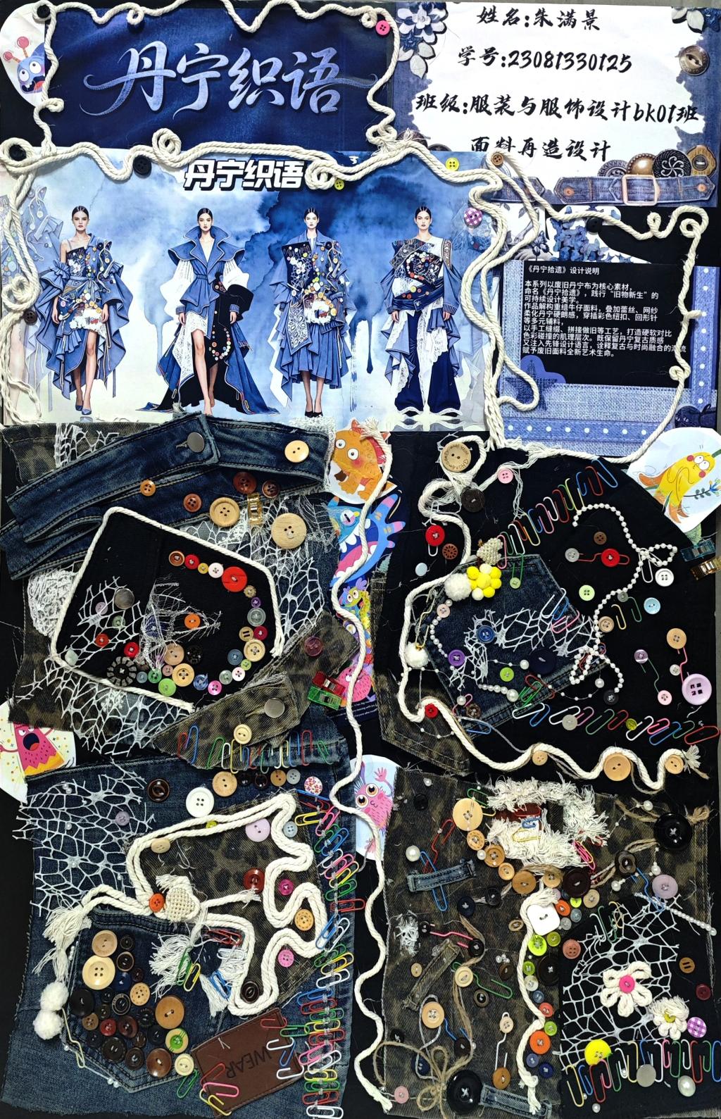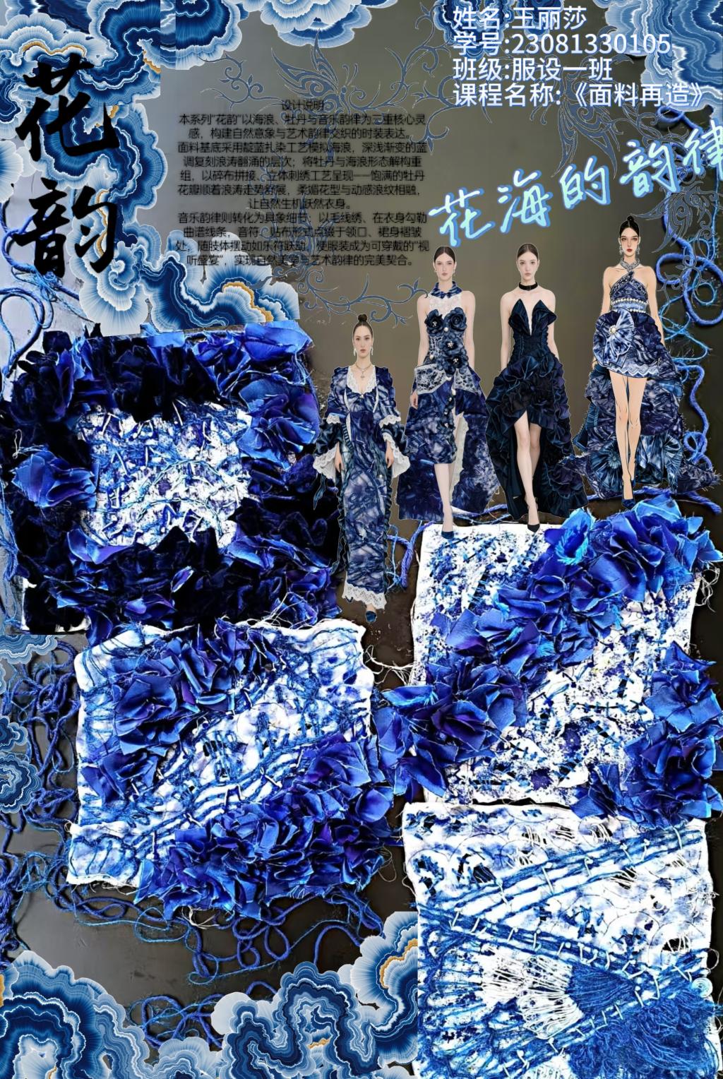 本次教学成果展出内容较为完整地呈现了从前期灵感收集、创意面料制作到结合AI辅助开展创意服装设计的学习过程,反映出学生在材料探索、工艺实践和设计表达方面的积极尝试。从所有作品的最终效果来看,学生在课程训练中逐步形成了对面料再造设计的基本认识,并在实践中不断增强动手能力和创新意识。部分作品在材料组合、肌理处理和形式转化方面具有较强的探索性,体现了课程在培养学生设计思维、实践能力和综合表达能力方面取得的较好成效,也为学生后续专业课程学习、毕业设计开展和未来职业发展积累了实践经验。